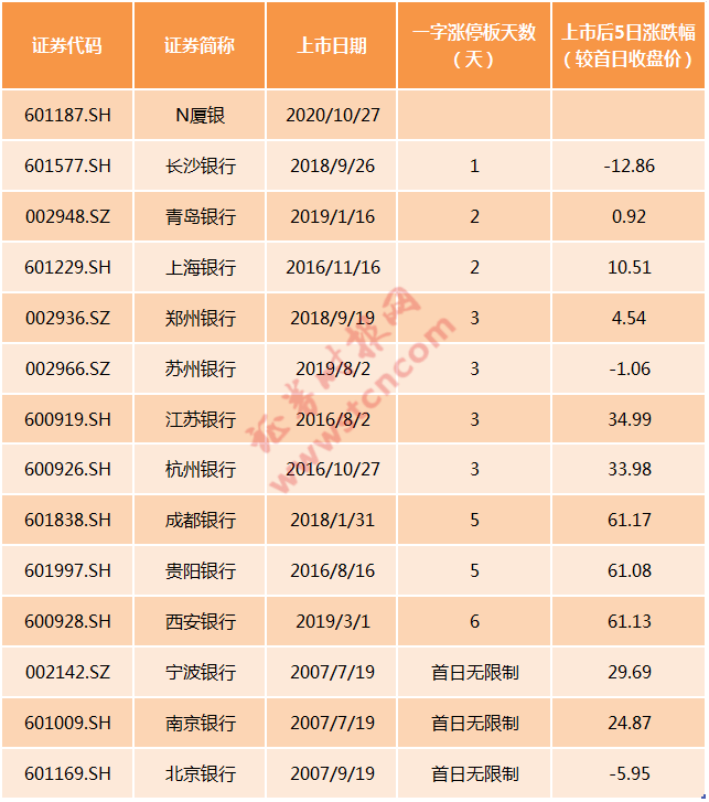 一直以来,银行股由于盘子大,新股表现相对较弱。记者统计A股14只城商行上市表现发现,2014年上市首日设置涨跌幅以来,上市后一字涨停板天数最多的是西安银行,连板天数为6天,其次成都银行、贵阳银行连板天数为5天。