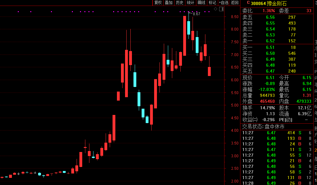 10月28日开盘豫金刚石大跌17%,截至午间收盘跌12.03%,报6.51元/股,半日成交6.17亿元,最新市值78.48亿元。