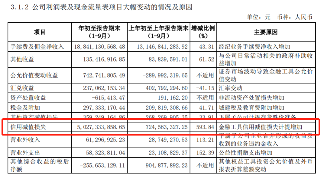 中信证券在三季报中对此有一句话解释,“主要是金融工具信用减值损失计提增加。”