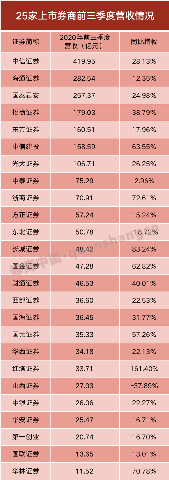 就前三季度营收同比增幅来看,25家披露业绩的上市券商中,有23家同比增加,其中红塔证券、长城证券、浙商证券、华林证券、中信建投等7家券商前三季度营收同比增幅超过50%。