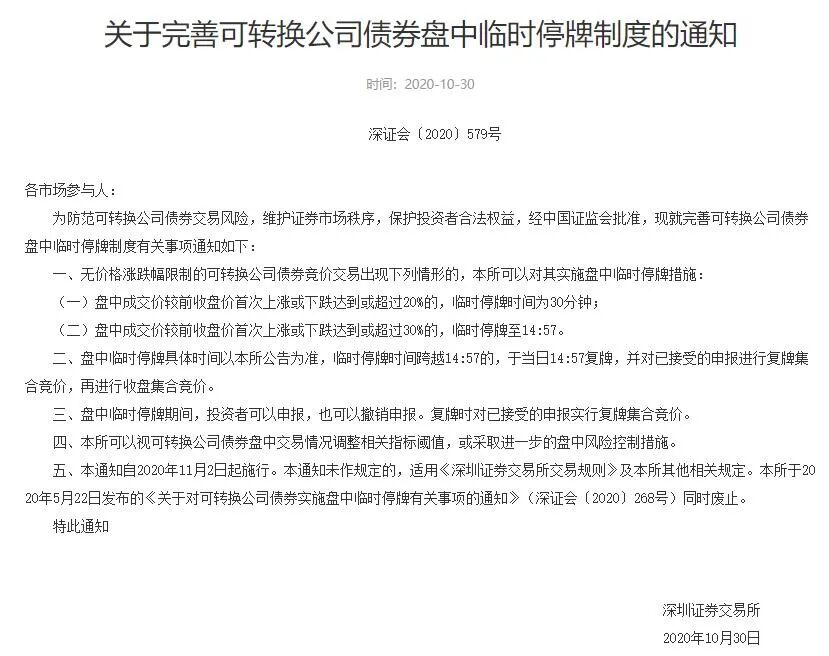 10月30日晚,深交所发布了关于完善可转换公司债券盘中临时停牌制度的通知,全文如下: