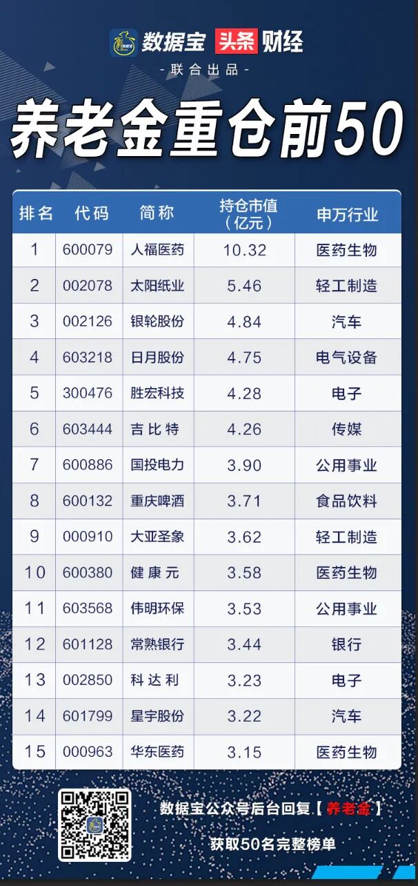 人福医药获养老金持仓10.32亿元排在首位,该公司是湖北省医药工业龙头,现已在神经系统用药、生育调节药、两性健康等细分领域形成领导或领先地位。三季度末,除养老金外,公司前十大流通股东中还聚集了北上资金、社保基金、证金公司、汇金公司、QFII等多路知名投资者。