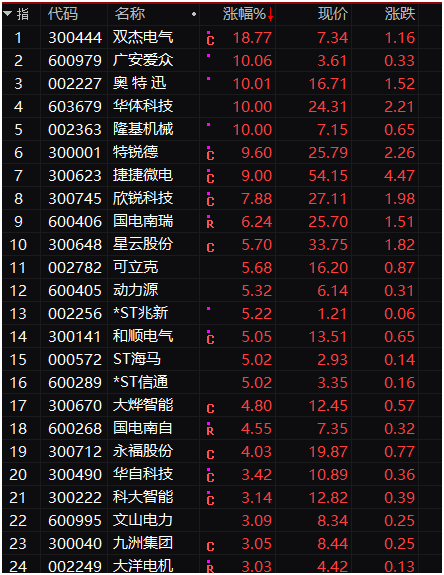 涨幅最大的双杰电气暴涨18.77%,该股较此前交易日明显放量。
