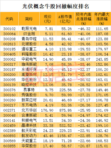 作为下半年最热的题材之一,光伏概念已经历多轮热炒,诞生了如阳光电源、锦浪科技、上机数控、迈为股份、汇川技术、福莱特、中能电气等大牛股。不过与前几次相比,今天的炒作力度已大为减弱。与年内高点相比,不少翻倍的光伏概念股已回撤不少。证券时报·数据宝统计显示,24股最新价较年内高点回撤20%以上,包括乾照光电、ST金刚、青岛中程、北玻股份、通裕重工、科隆股份、中能电气等。