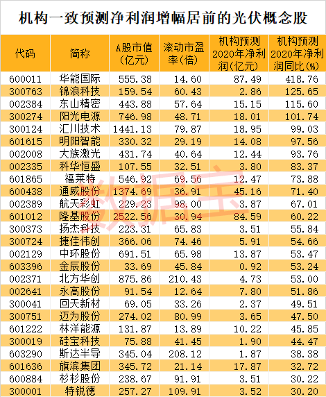 从机构盈利预测数据来看,不少光伏概念股全年业绩可期。数据显示,按照5家以上机构一致预测数据,36股今年净利润有望同比增长20%以上,其中华能国际、锦浪科技、东山精密、阳光电源等4股有望翻倍增长。机构预测净利润增幅最高的是华能国际,净利润有望达到87.49亿元,同比增长418.76%。华能国际是中国最大的上市发电公司之一,三季度业绩在用电需求持续复苏以及燃料价格同比下降的情况下明显好转,单季实现盈利34亿元,同比增长117.33%。