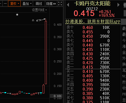 港股光伏新能源集体暴走,卡姆丹克太阳能收盘涨幅169.48%,顺风清洁能源涨73.45%,还有北控清洁能源集团、协鑫新能源等仙股纷纷被爆炒。卡姆丹克太阳能今日涨幅排在港股第一位,该股短短2个交易日内涨幅已达到245.83%。