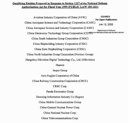美国此前将把89家中国企业定义为有军事背景,禁止他们购买美国产品和科技。