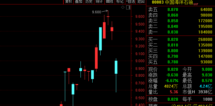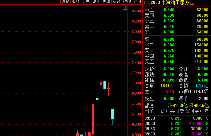 截止发稿,港股中国海洋石油跌幅扩大至超6%,中海油田服务跌超9%。A股中中海油服从短暂的跳水中拉回,截至发稿下跌0.88%。另外,中国建筑也出现跳水现象。