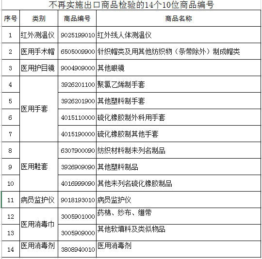 e公司讯,海关总署12月3日消息,自公告发布之日起,对“9025199010”等14个10位商品编号项下的医疗物资不再实施出口商品检验。具体产品包括:红外线人体测温仪、医用护目镜等。