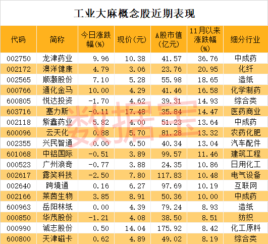 受该消息刺激,工业大麻概念昨日出现异动情况。通化金马、龙津药业涨停,顺灏股份、紫鑫药业、澳洋健康、亚太药业、福安药业等均涨超4%。