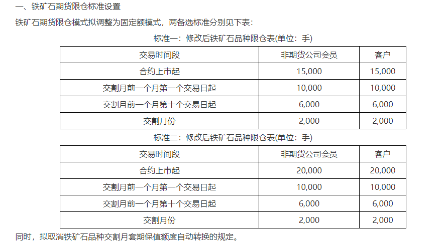 e公司讯,大商所:为强化铁矿石市场风险管理,拟调整铁矿石期货持仓限额相关规定,现就拟调整的铁矿石限仓标准和实施时间公开征求市场意见。