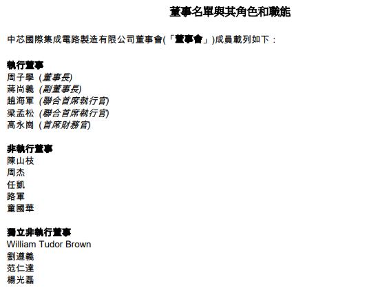 e公司讯,中芯国际31日在港交所公告的最新董事会名单显示,梁孟松仍担任联席CEO。中芯国际董事会成员包括董事长周子学、副董事长蒋尚义、联席CEO赵海军与梁孟松、首席财务官高永岗,非执行董事陈山枝、周杰、任凯、路军、童国华,以及独立非执行董事William Tudor Brown、刘遵义、范仁达、杨光磊。