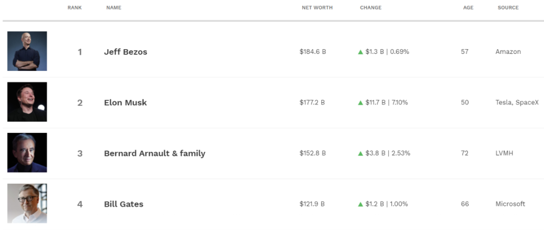 马斯克在7月超过巴菲特,成为第七大富豪。11月,马斯克超越比尔 - 盖茨,成为第二大富豪。马斯克在过去12个月里获得的财富超过了比尔 - 盖茨1320亿美元的全部净资产。