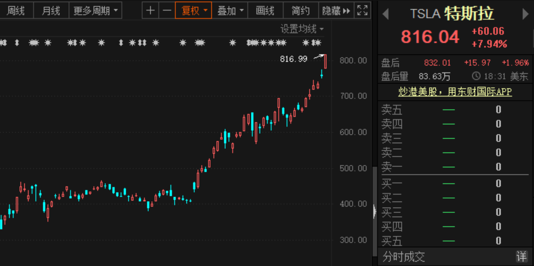 特斯拉依然是明星,股价大涨近8%突破800美元,再创历史新高,市值超7700亿美元。随着特斯拉股价的不断飙升,马斯克超越亚马逊创始人贝佐斯,坐上了亿万富豪指数的头把交椅。