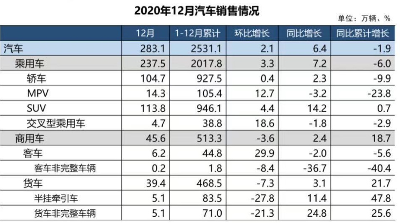 中汽协:2020年12月乘用车销量同比增长7.2%
