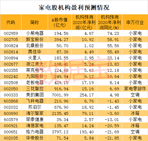 目前公布业绩预告的家电股较少,从机构预测的情况可以初见端倪。数据宝统计显示,根据5家以上机构一致预测数据,8只家电股2020年净利润有望同比增长10%以上,分别包括小熊电器、新宝股份、北鼎股份、奥佳华、火星人、浙江美大、莱克电气、九阳股份等。预测增幅最高的是小熊电器,2020年净利润有望达到4.67亿元,同比增长74%。