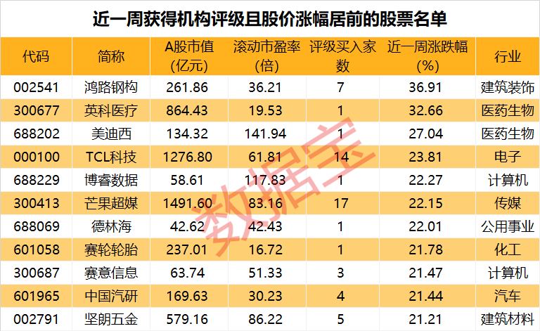 有15只获得机构买入型评级的股票股价周累计上涨幅度超20%,其中有不少是前段时间受到冷落的昔日牛股,近期重获机构的芳心。