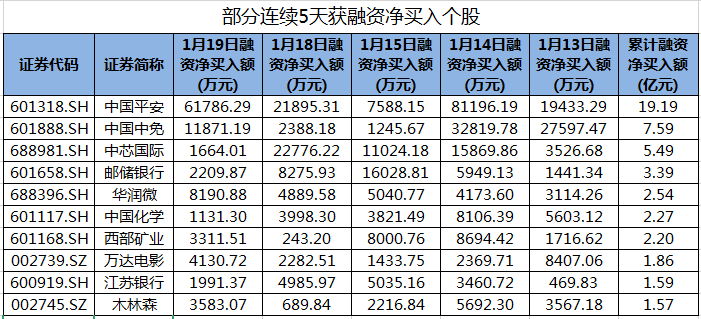 e公司讯,据同花顺iFinD统计显示,近5个交易日(1月13日-1月19日)50股连续5天获融资净买入。获融资净买入较多有中国平安、中国中免、中芯国际、邮储银行、华润微等股。其中,中国平安5天累计融资净买入19.19亿元,位居榜首。