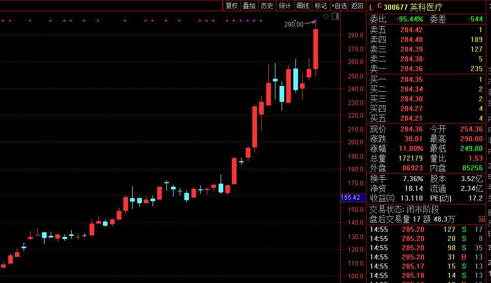 英科医疗作为防疫耗材牛股,2020年累计涨幅高达一年14倍,期末获中欧医疗健康A、前海开源等55家基金持仓,并且今年开年以来上涨近70%,在1月22日股价报收284.36元/股,总市值突破千亿大关。