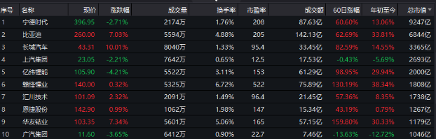 A股新能源汽车板块市值排名情况