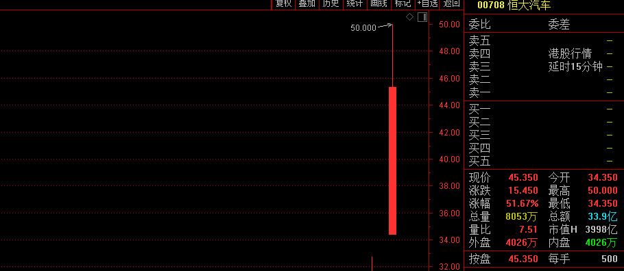 另一“吸睛”公司当属恒大汽车,今日大幅高开,最终收涨51.67%,市值飙升至近4000亿港元。