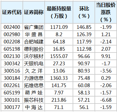 e公司讯,证券时报•数据宝统计显示,截至1月28日,根据香港交易所公布的陆股通持股记录,陆股通共持有2213只个股,环比上一日,增持的有709只。增仓幅度来看,持股量环比增幅在30%以上的共有31只,环比增幅最大的是省广集团,陆股通最新持有1171.09万股,持股量环比增幅达146.85%;环比增幅较大的还有华盛昌、合肥城建、德利股份等股。