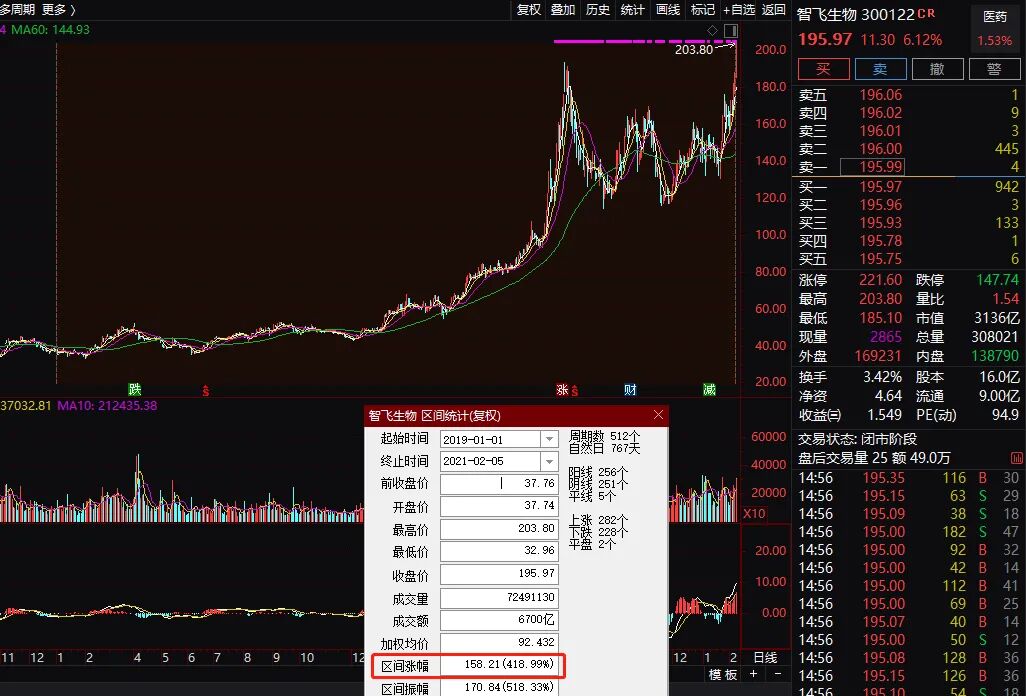 2月5日,智飞生物股价大涨6.12%再创历史新高,收报195.97元,市值达3136亿元。2019年以来,智飞生物股价涨幅高达419%,也是只大牛股。