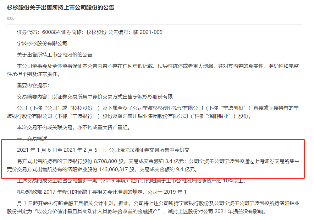 2月5日晚间,杉杉股份公告称,1月6日至今,公司通过深交所集中竞价交易方式出售了所持有的宁波银行870.88万股,成交金额约3.4亿元。本次出售后,杉杉股份不再持有宁波银行股份。