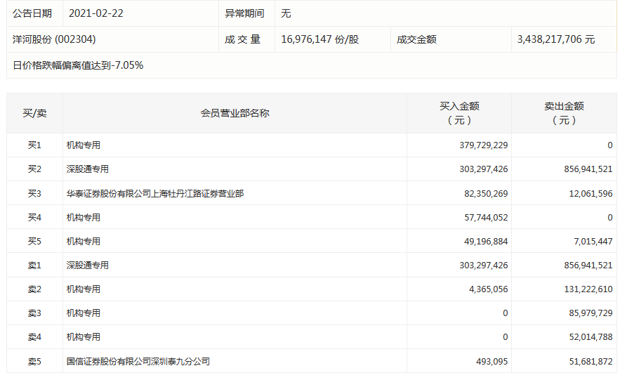 龙虎榜:洋河股份大跌8.56% 北向资金净卖出逾5亿元,机构净买入