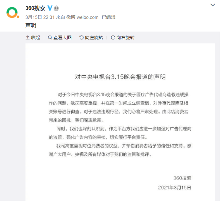 A股上市公司三六零也被央视点名,360搜索医药广告造假链条被曝光。在360上海广告总代理经格网络科技有限公司,销售经理称:“在网站里面不能有任何品牌。把微信推给人去聊聊,聊完之后卖产品。”对于这样的广告违规不少代理公司心知肚明。就算对方没有资质,广告也能投放出去。360搜索官方微博很快回应,对违法违规行径,必将严肃处理,给消费者带来的困扰深表歉意。