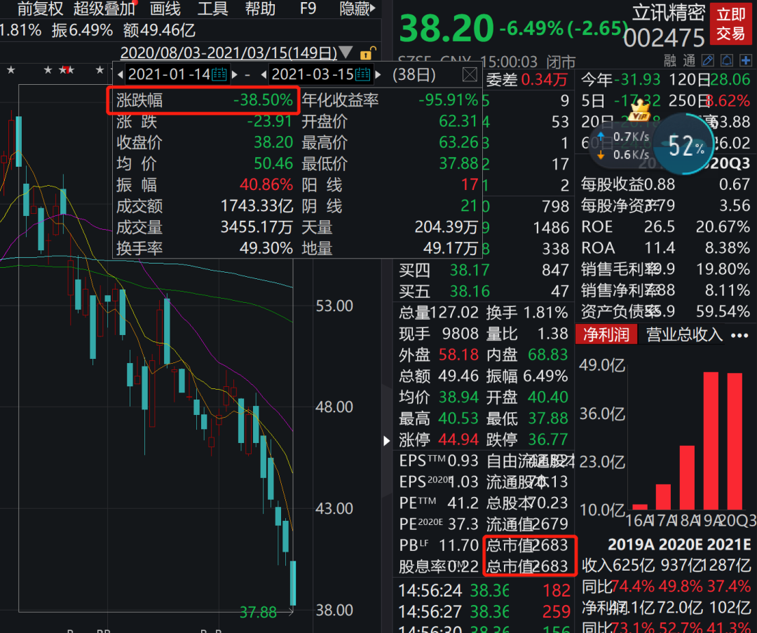 截至3月15日收盘,立讯精密收于38.2元每股,股价相较于2个月前的60元的高点,暴跌近40%;相较于一周前的近50元股价,也暴跌近20%。