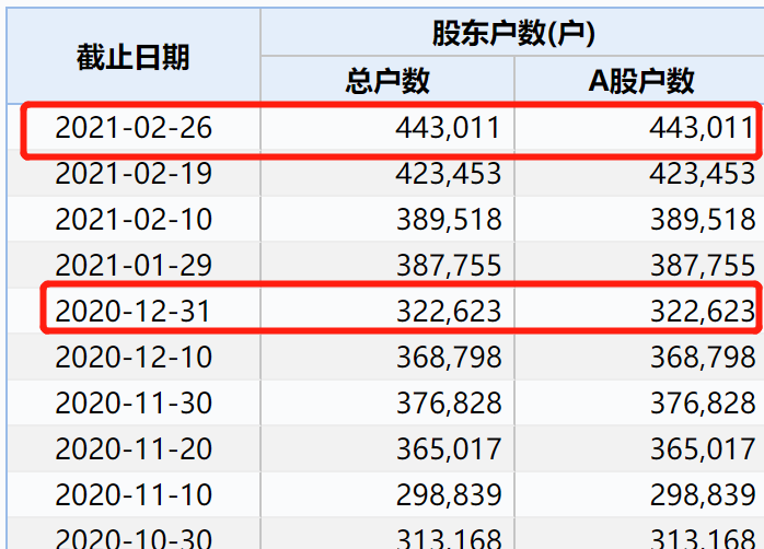 数据显示,这两个月立讯精密的股东户数激增。2020年底,立讯精密的股东户数仅32万,而截至2021年2月26日,股东户数激增至44万,这意味着,期间试图”抄底“的股东超12万。