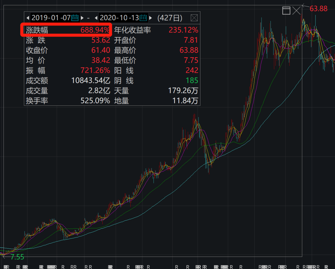 数据显示,2019年1月至2020年底,该股从不足8元的股价,最高暴涨至近63.88元每股,随后几个月在60元附近震荡,并在2021年1月中开启暴跌模式。