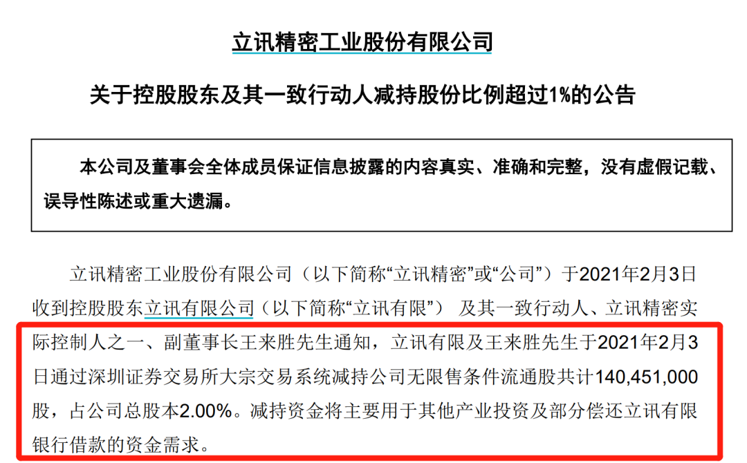 最近一次是2月3日。立讯精密控股股东立讯有限公司(以下简称“立讯有限”) 及其一致行动人、立讯精密实际控制人之一、副董事长王来胜通过深圳证券交易所大宗交易系统减持公司无限售条件流通股共计1.4亿股,占公司总股本2.00%。减持资金将主要用于其他产业投资及部分偿还立讯有限银行借款的资金需求。