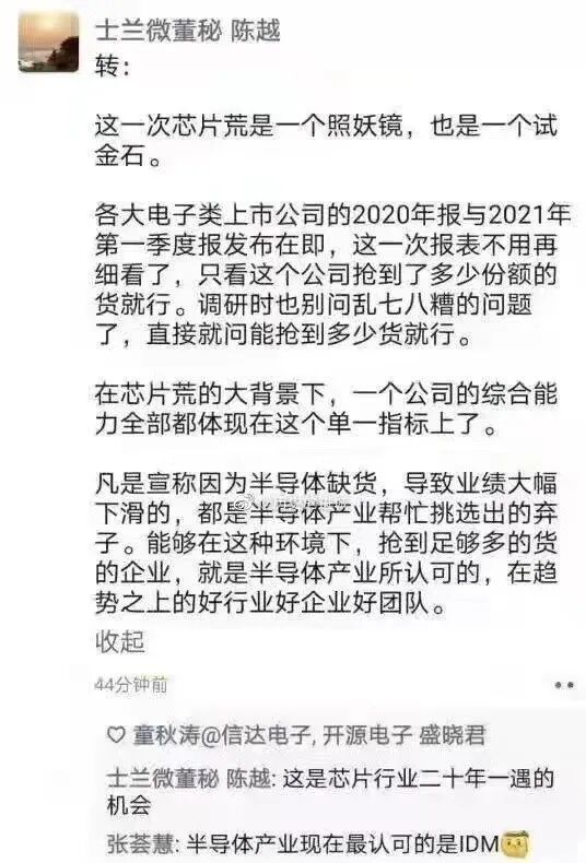 陈越在朋友圈转发的一段文字被网友截图上传网络,随即引发关注,文字内容称:“这一次芯片荒是一个照妖镜,也是一个试金石。各大电子类上市公司的2020年报与2021年第一季度报发布在即,这一次报表不用再细看了,只看这个公司抢到了多少份额的货就行。调研时也别问乱七八糟的问题了,直接就问能抢到多少货就行。在芯片荒的大背景下,一个公司的综合能力全部都体现在这个单一指标上了。”