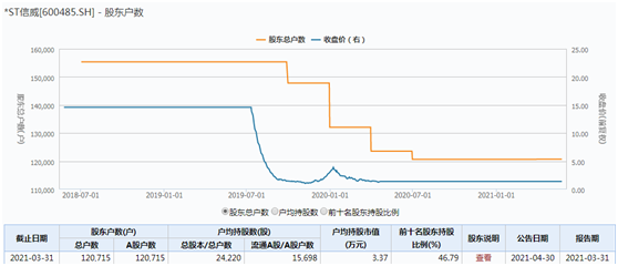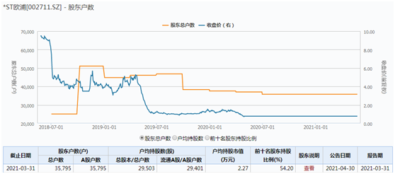 Wind数据显示,截至今年一季度末,*ST欧浦、*ST信威、*ST鹏起、*ST富控4家上市公司最新股东户数分别为35795户、120715户、49946户、32382户,总计23.88万户。