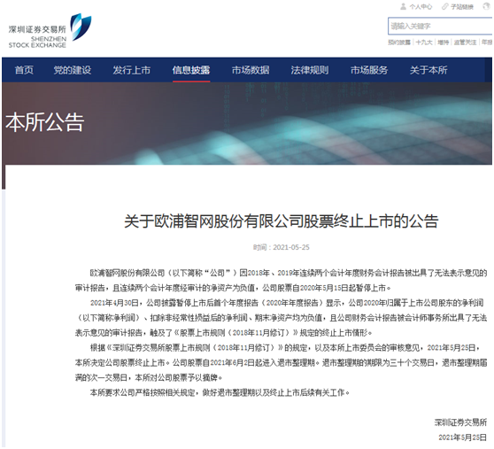 其中,深交所发布《关于欧浦智网股份有限公司股票终止上市的公告》,*ST欧浦因2018年、2019年连续两个会计年度财务会计报告被出具了无法表示意见的审计报告,且连续两个会计年度经审计的净资产为负值,公司股票自2020年5月15日起暂停上市。