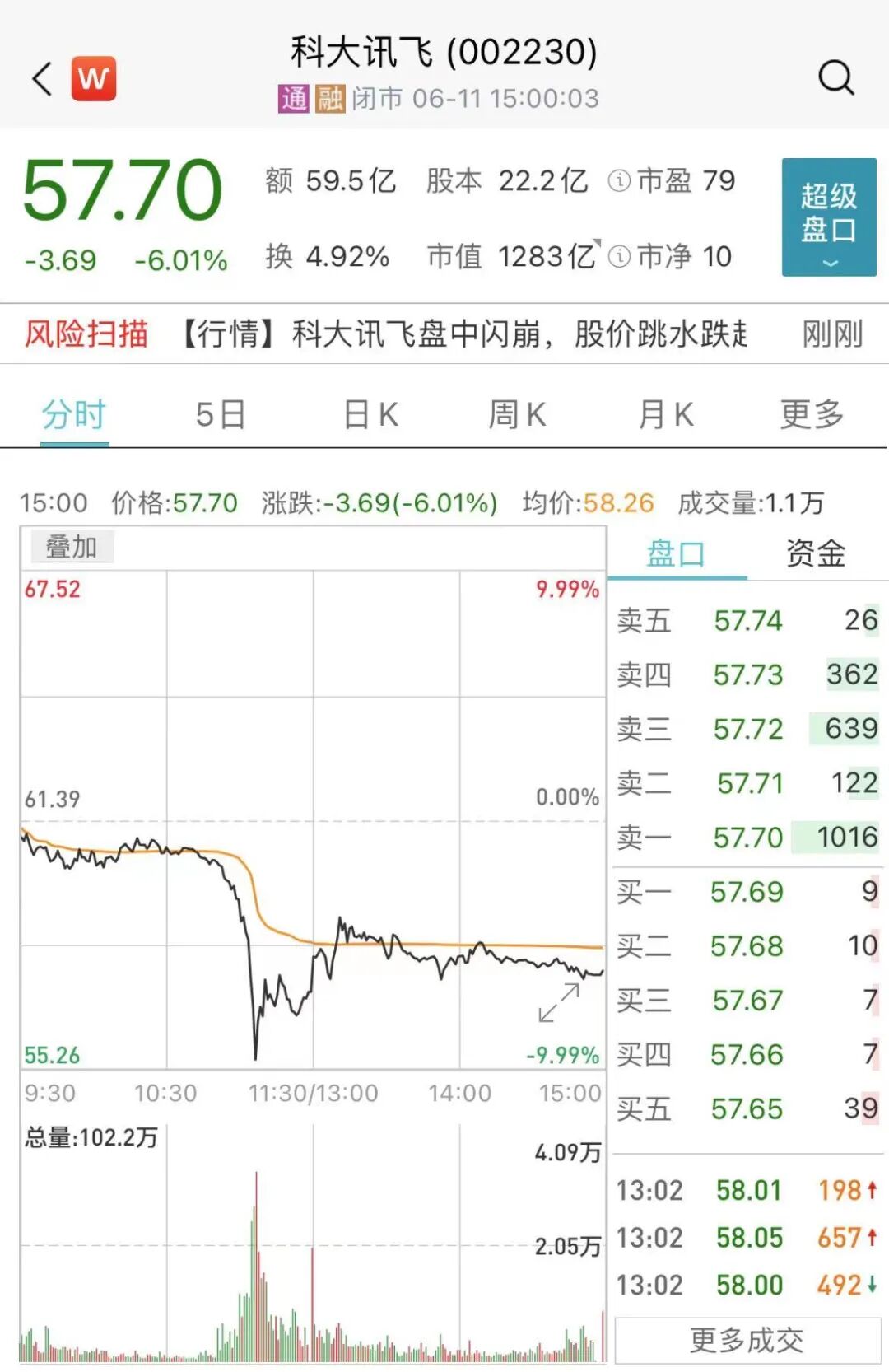 6月11日,科大讯飞股价盘中跳水,一度逼近跌停。