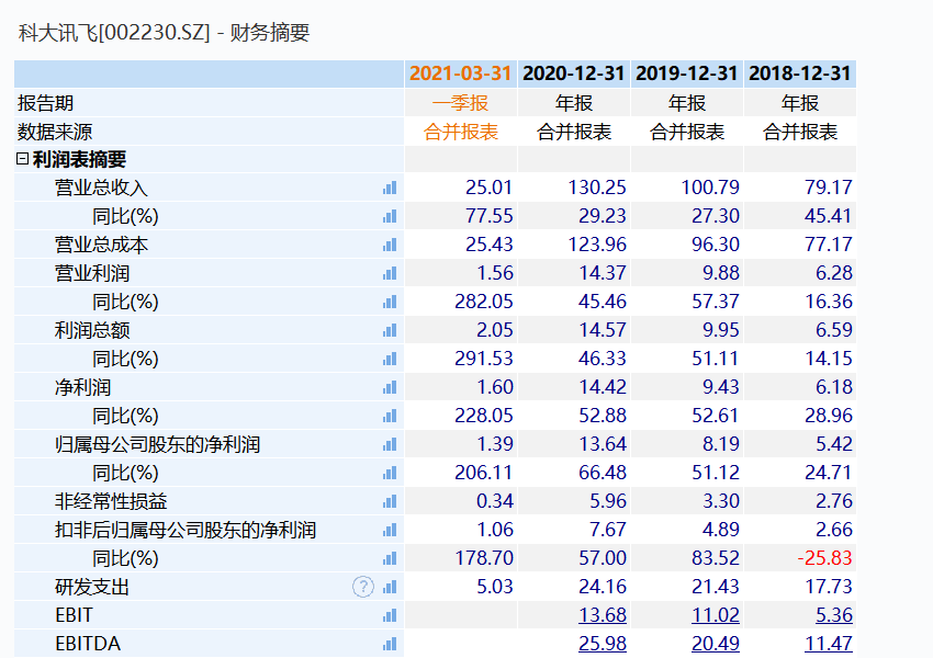 科大讯飞股份有限公司成立于1999年,是一家主要从事智能语音及语言技术、人工智能技术研究等业务的企业。公司2020年年报显示,公司主营业务为软件和信息技术服务业、教育教学,占营收比例分别为:98.43%、1.28%。2020年,科大讯飞实现营收130.25亿元,同比增长29.23%;实现归母净利润13.64亿元,同比增长66.48%。