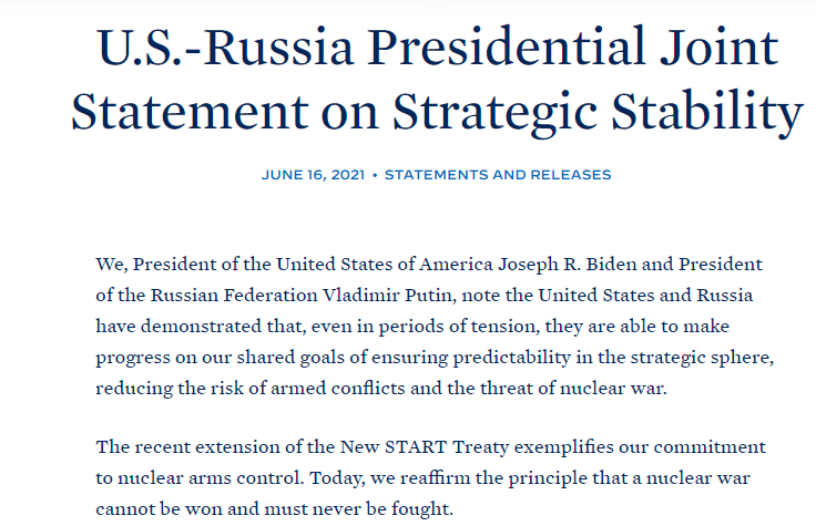 声明表示,美国总统拜登和俄罗斯联邦总统普京指出,美国和俄罗斯已经证明,即使在紧张时期,也能够在我们的共同目标上取得进展,即确保战略领域的可预测性,减少武装冲突的风险和核战争的威胁。
