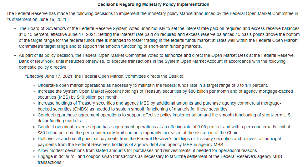 为落实联邦公开市场委员会在2021年6月16日的声明中宣布的货币政策立场,美联储做出以下决定:
