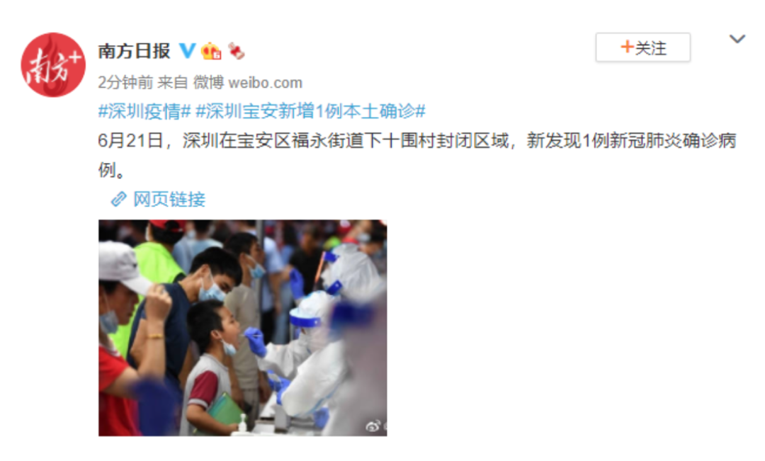 6月21日,深圳在宝安区福永街道下十围村封闭区域,新发现1例新冠肺炎确诊病例。