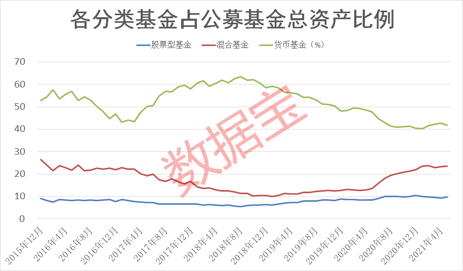 将公募基金按基金投资范畴分类,货币基金以41.9%的规模稳占鳌头(计算包括封闭式基金),近三年来货币基金占比逐渐下降,混合基金、股票基金近年来资产分布占比明显提升。2018年5月数据,货币基金占比61.86%,三年后占比下降约20%,股票型基金占比由6%提升至9.71%,混合型基金占比由12.5%提升至23.54%,比例大幅提高。