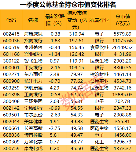 以公募基金定期报告披露的十大重仓股名单显示,一季度持股市值变化最大的有海康威视、招商银行、贵州茅台、兴业银行、智飞生物、平安银行,较年末持股市值增加100亿以上,其中海康威视持股市值增加310.94亿元排在首位,该股年初至今上涨24.66%。