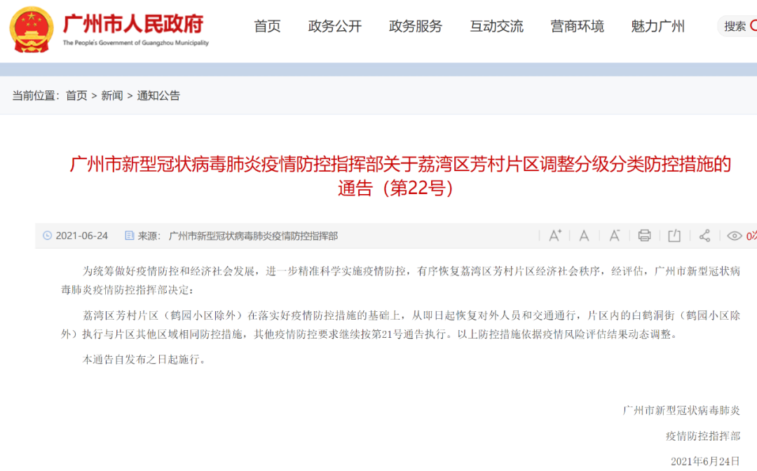 今天(6月24日)下午2点,广州市新型冠状病毒肺炎疫情防控指挥部发布“关于荔湾区芳村片区调整分级分类防控措施的通告(第22号)”。