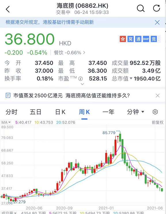 截至收盘,海底捞最新总市值1950亿港元,较股价高位的市值4544.75亿港元,蒸发了2500亿港元。