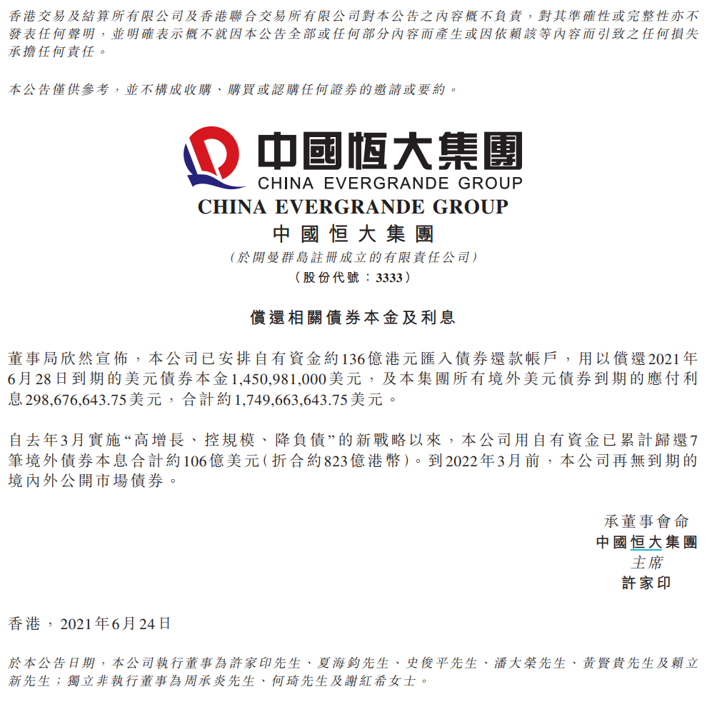 今日,中国恒大发布公告,已安排自有资金约136亿港元汇入债券还款账户,用以偿还今年6月28日到期的14.5亿美元债,以及所有境外美元债到期的应付利息近3亿美元,合计约17.5亿美元。至此,恒大到2022年3月前,再无到期的境内外公开市场债券。