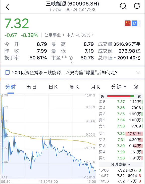 三峡能源放量巨震。今日继续涨停开盘,但随后便直线下杀,一度触及跌停。截至收盘,三峡能源跌幅达8.39%。