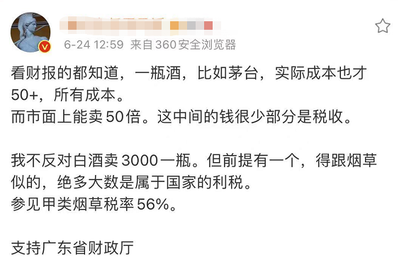 据广东省财政厅网站6月23日消息,广东省财政厅6月18日向广东省人大代表关正生作出《关于广东省十三届人大四次会议第1364号代表建议答复的函》称,您提出的“一瓶3000元零售价的茅台和一瓶10元的广东米酒,同样征0.5元从量消费税,存在不合理之处,建议按国家统计口径统一以65度计算白酒产量来折算计征从量消费税”的建议,对于推动完善消费税、促进白酒行业健康发展具有积极的意义。目前,国家正在加紧推进消费税法立法,在前期征求意见阶段我们已反馈了有关意见和建议,其中包括建议按白酒不同度数设定不同比例税率或取消从量定额等。