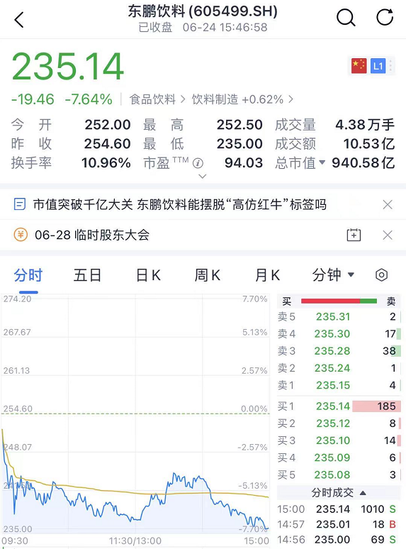 东鹏饮料此次发行价为46.27元/股,上市后连续14个交易日涨停,6月17日,东鹏饮料低开高走,最终收涨5%报241.5元/股,全天成交额达30.3亿元,换手率接近33%。